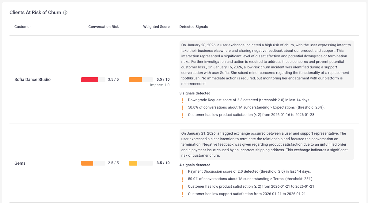 Our AI continuously monitors support conversations to detect subtle signals of customer dissatisfaction